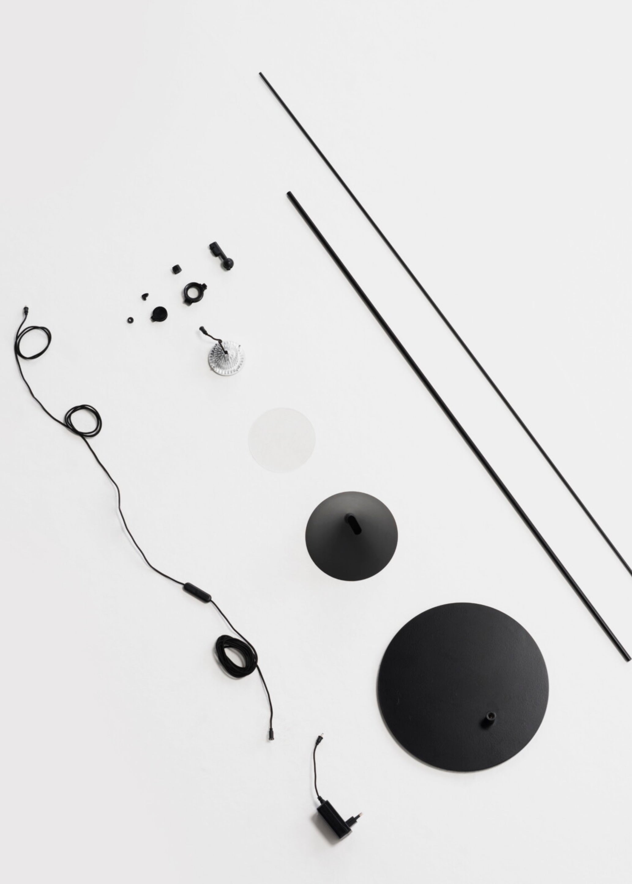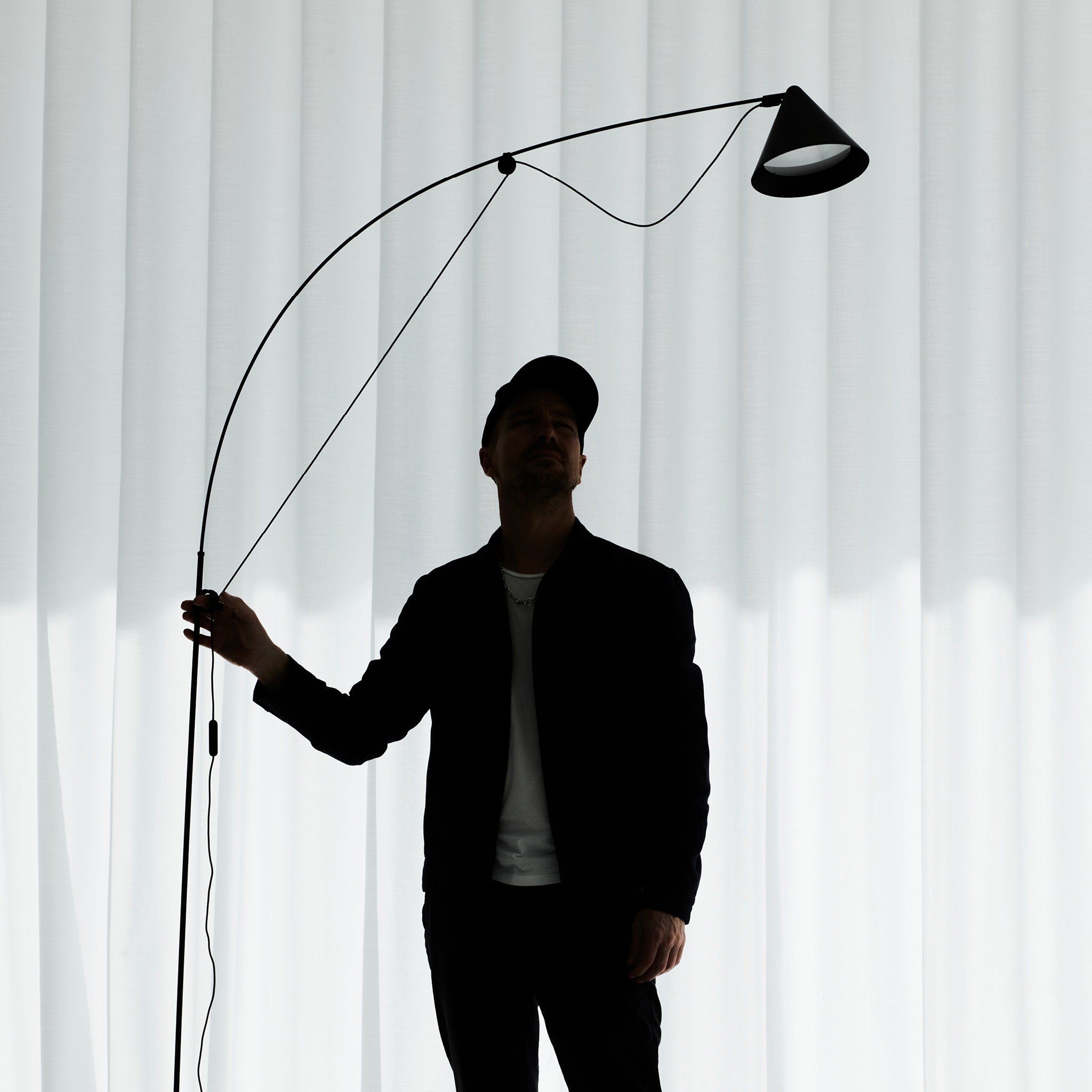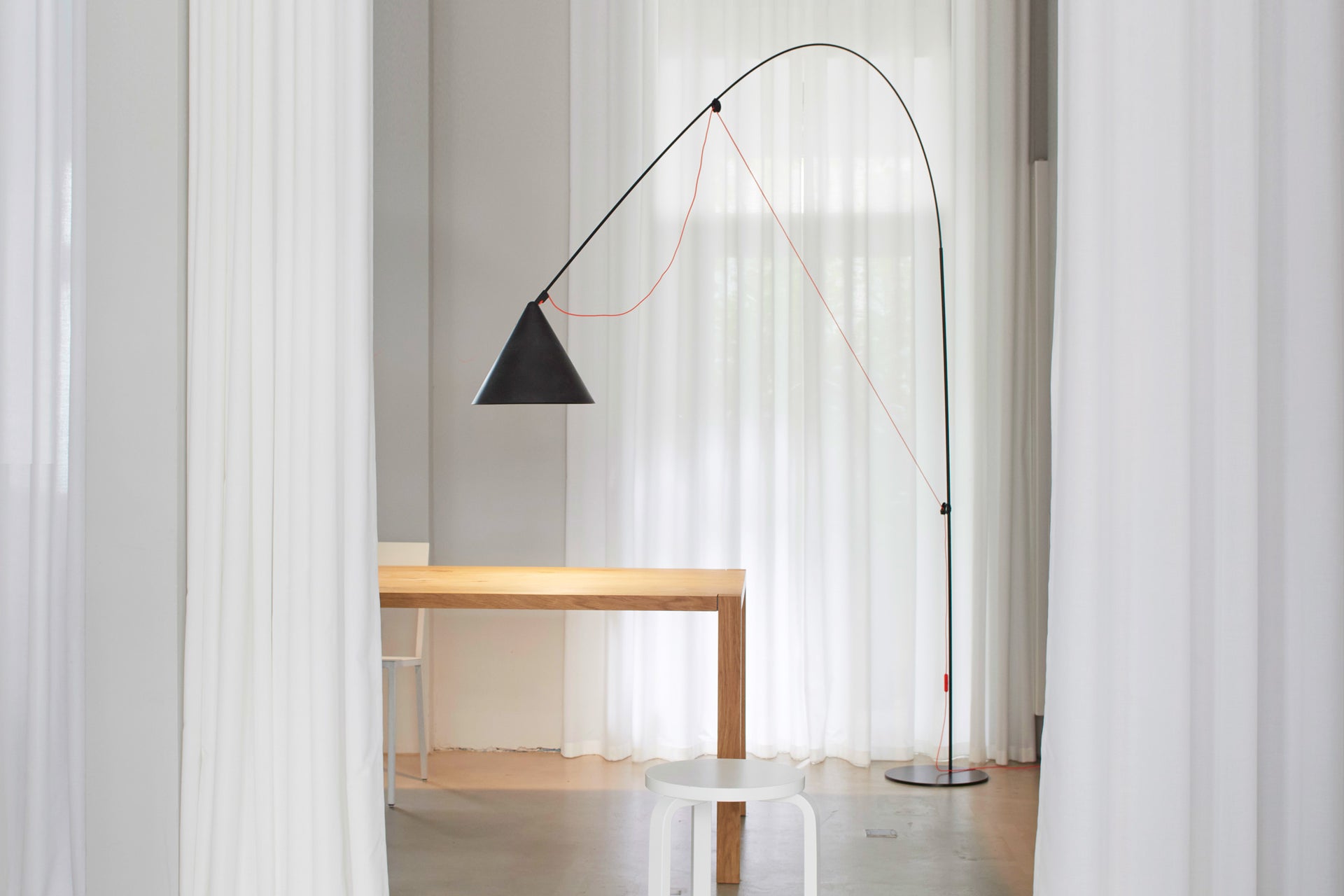 Central feature of the AYNO lighting family is a fiberglass rod, which is stretched to the bow by the luminaire cable. The inherent tension of the rod allows a lamp without any joints. By sliding the two adjustment rings attop and bottom, the fiberglass rod is bent into the desired position and the light is directed where needed. The cable tightens the rod into an arc, of which the radius can be varied as required using the adjustment rings. The fine adjustment is done with the swiveling lampshade.