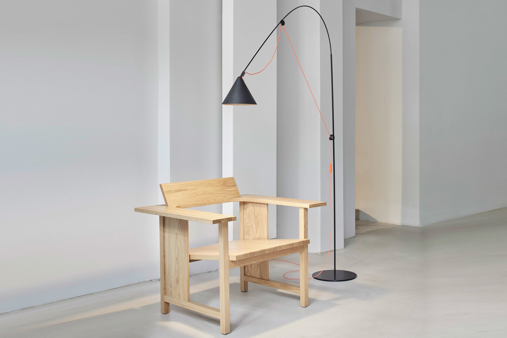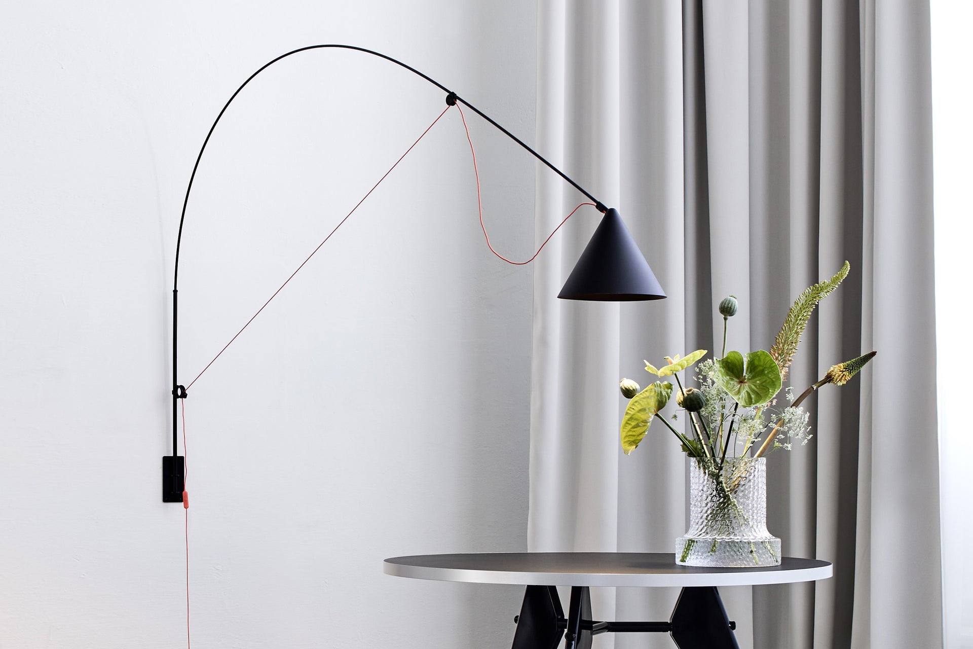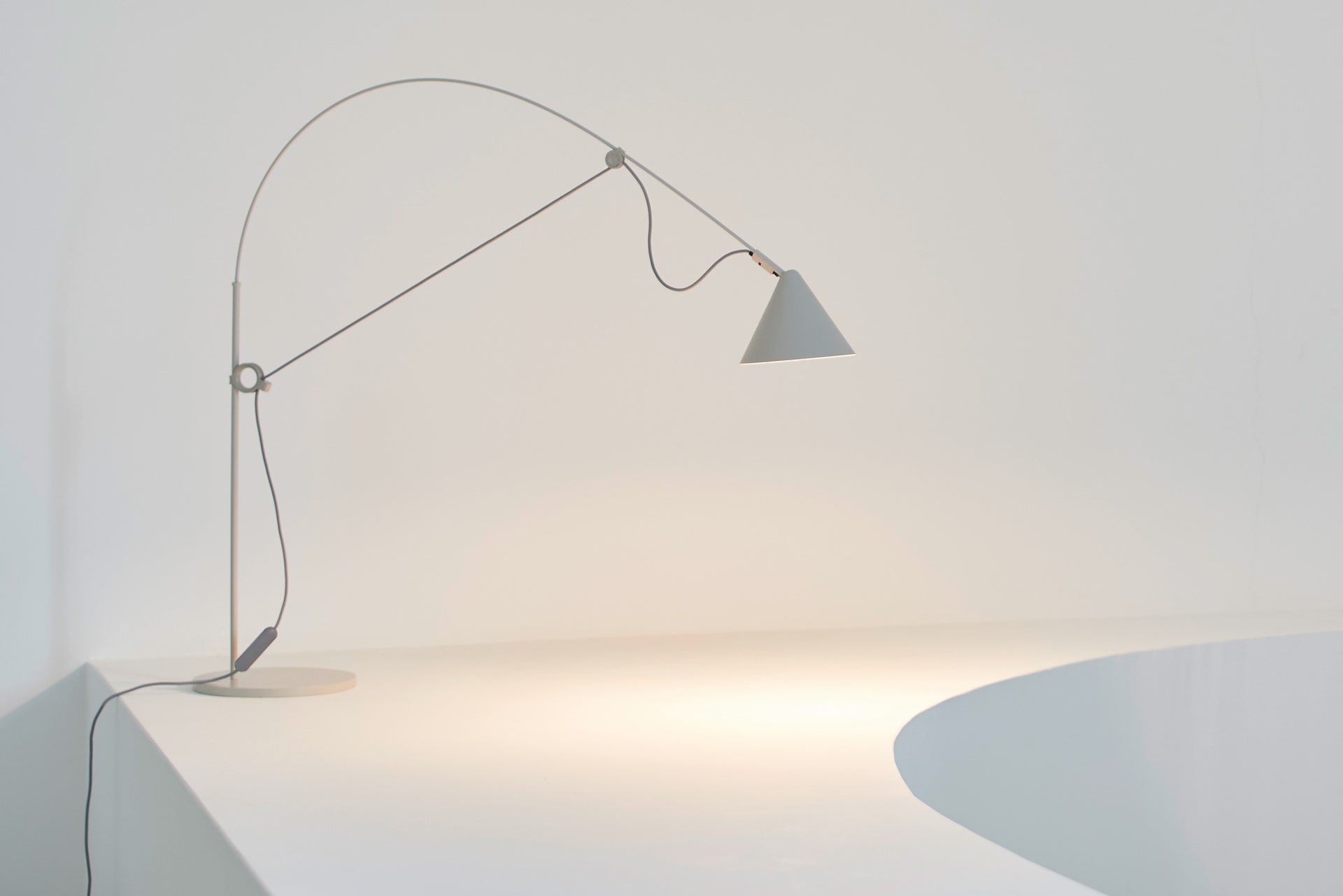 Central feature of the AYNO lighting family is a fiberglass rod, which is stretched to the bow by the luminaire cable. The inherent tension of the rod allows a lamp without any joints. By sliding the two adjustment rings attop and bottom, the fiberglass rod is bent into the desired position and the light is directed where needed. The cable tightens the rod into an arc, of which the radius can be varied as required using the adjustment rings. The fine adjustment is done with the swiveling lampshade.