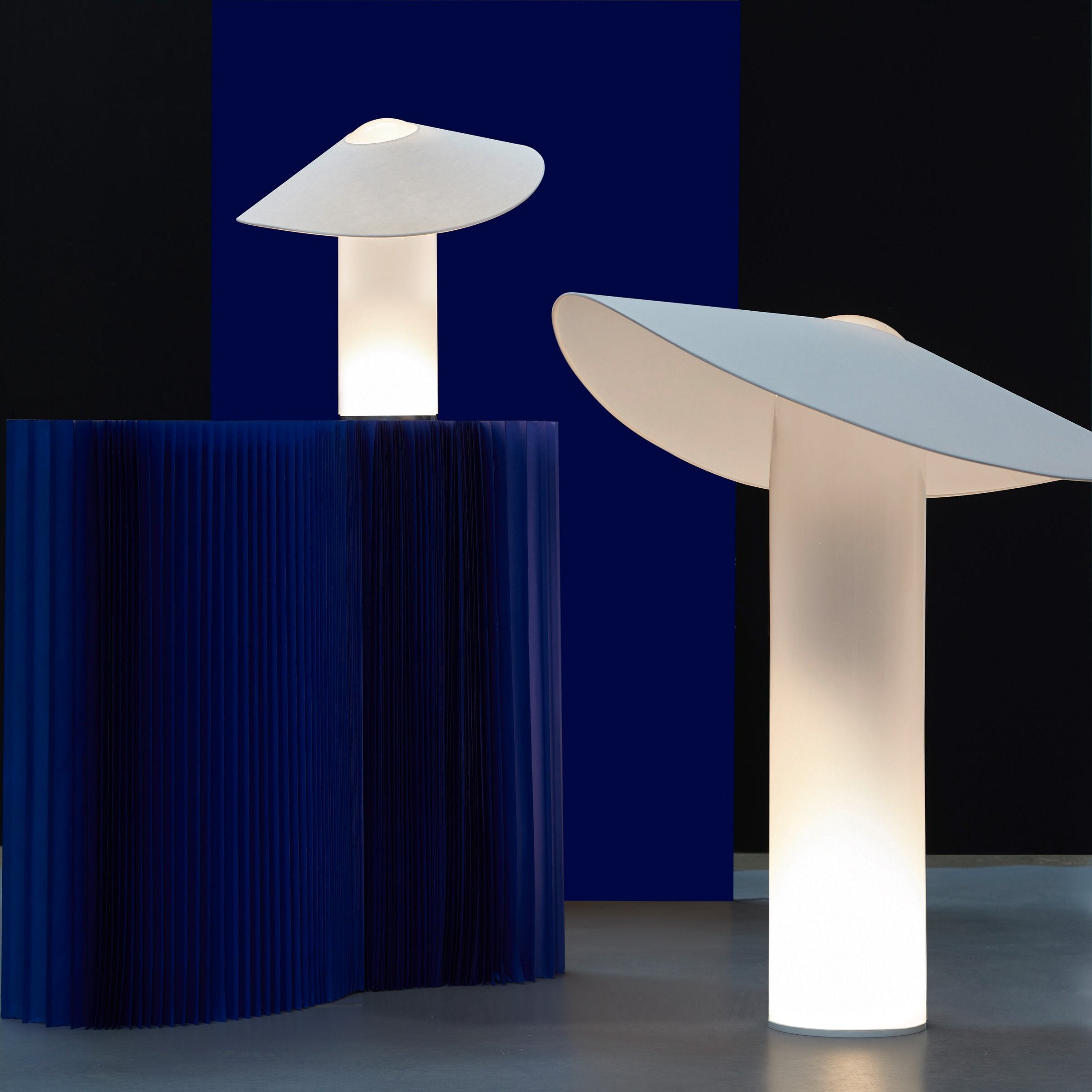 Sculpturale dans sa présence et belle en tant qu'objet. L'abat-jour librement ajustable, avec son geste caractéristique, permet un jeu atmosphérique d'éclairage direct et indirect.