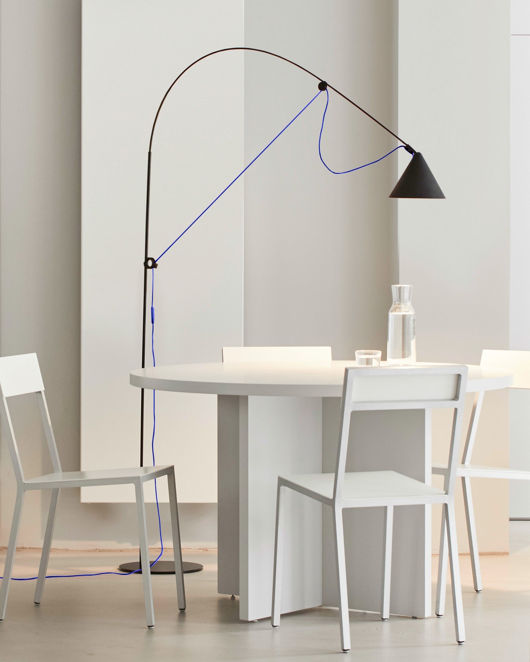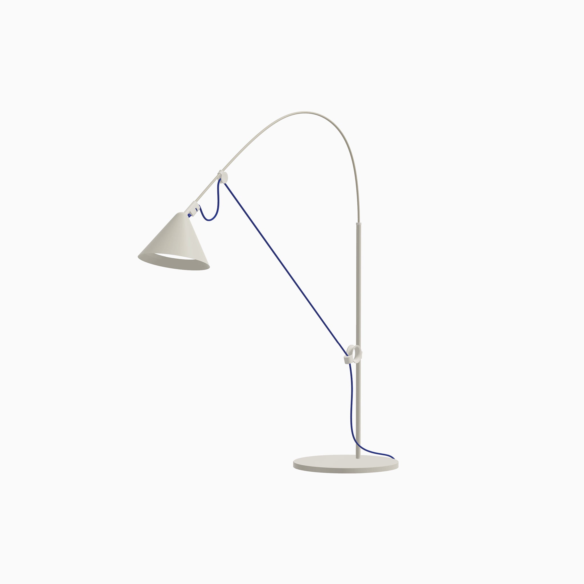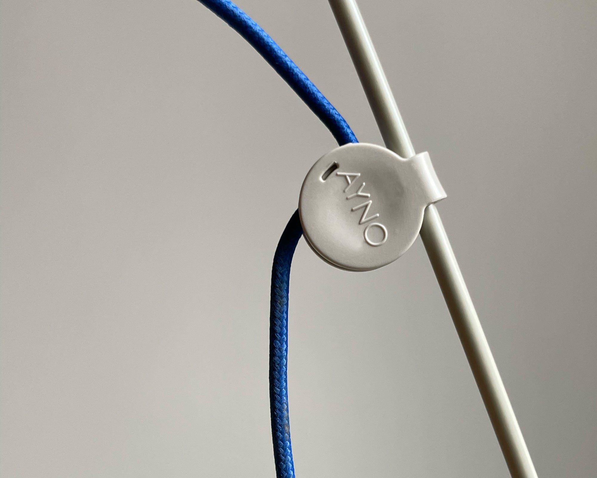 AYNO L floor lamp by Stefan Diez in a special colour edition for ZEIT with the textile cable in ultramarine. LED dimmable and tool-free exchangeable. Patented design made in Germany.
