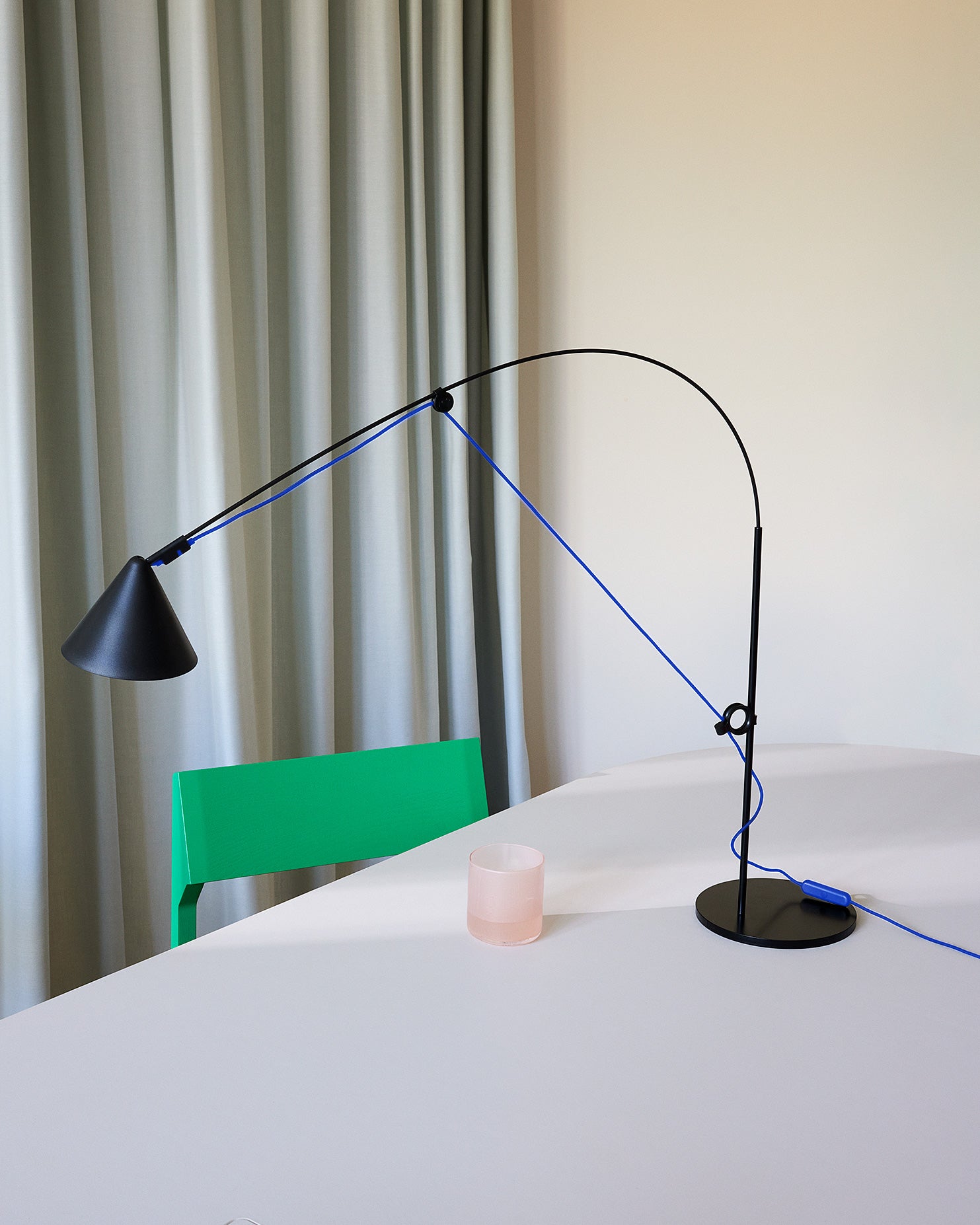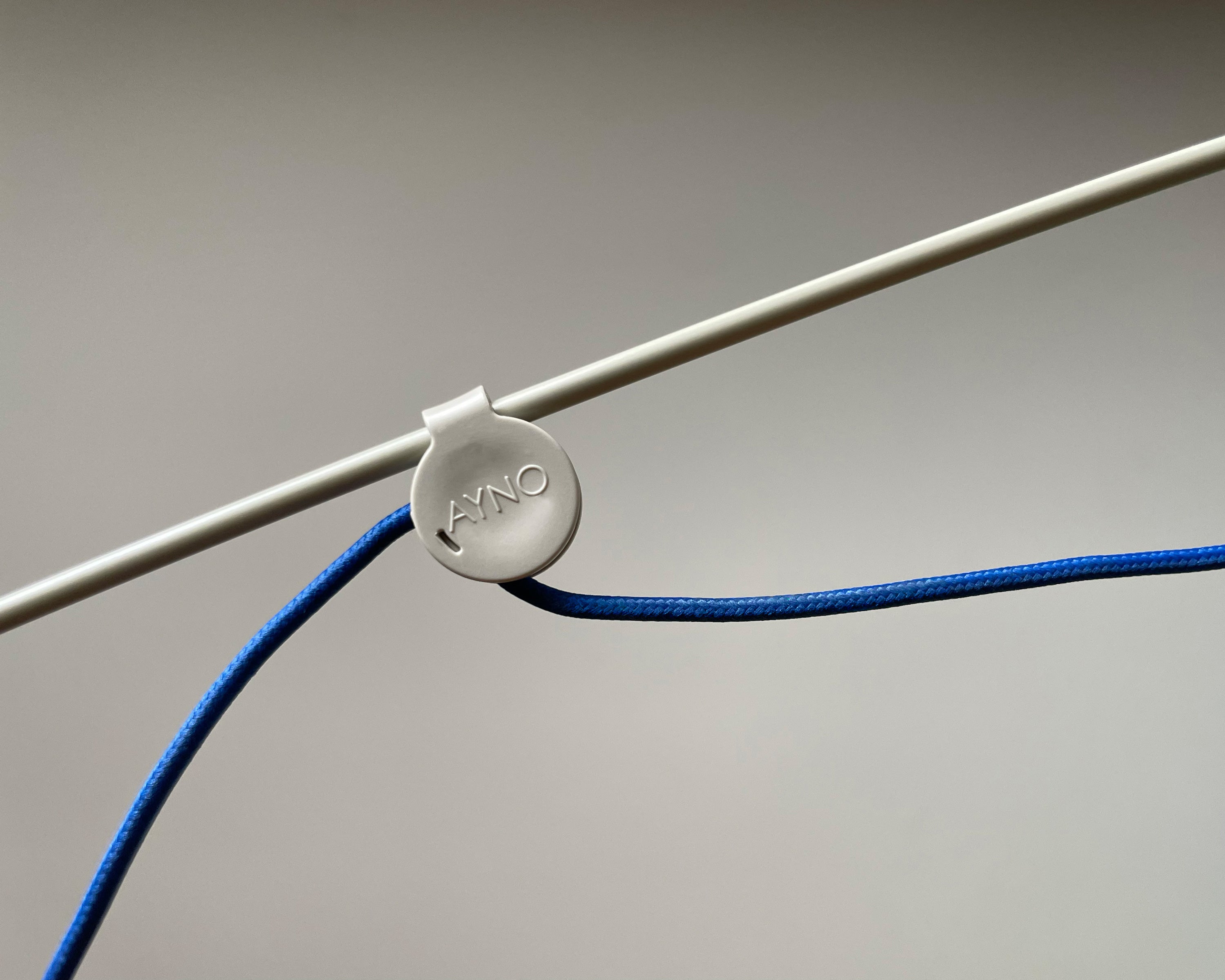AYNO S table lamp by Stefan Diez in a special colour edition for ZEIT with the textile cable in ultramarine. LED dimmable and tool-free exchangeable. Patented design made in Germany.