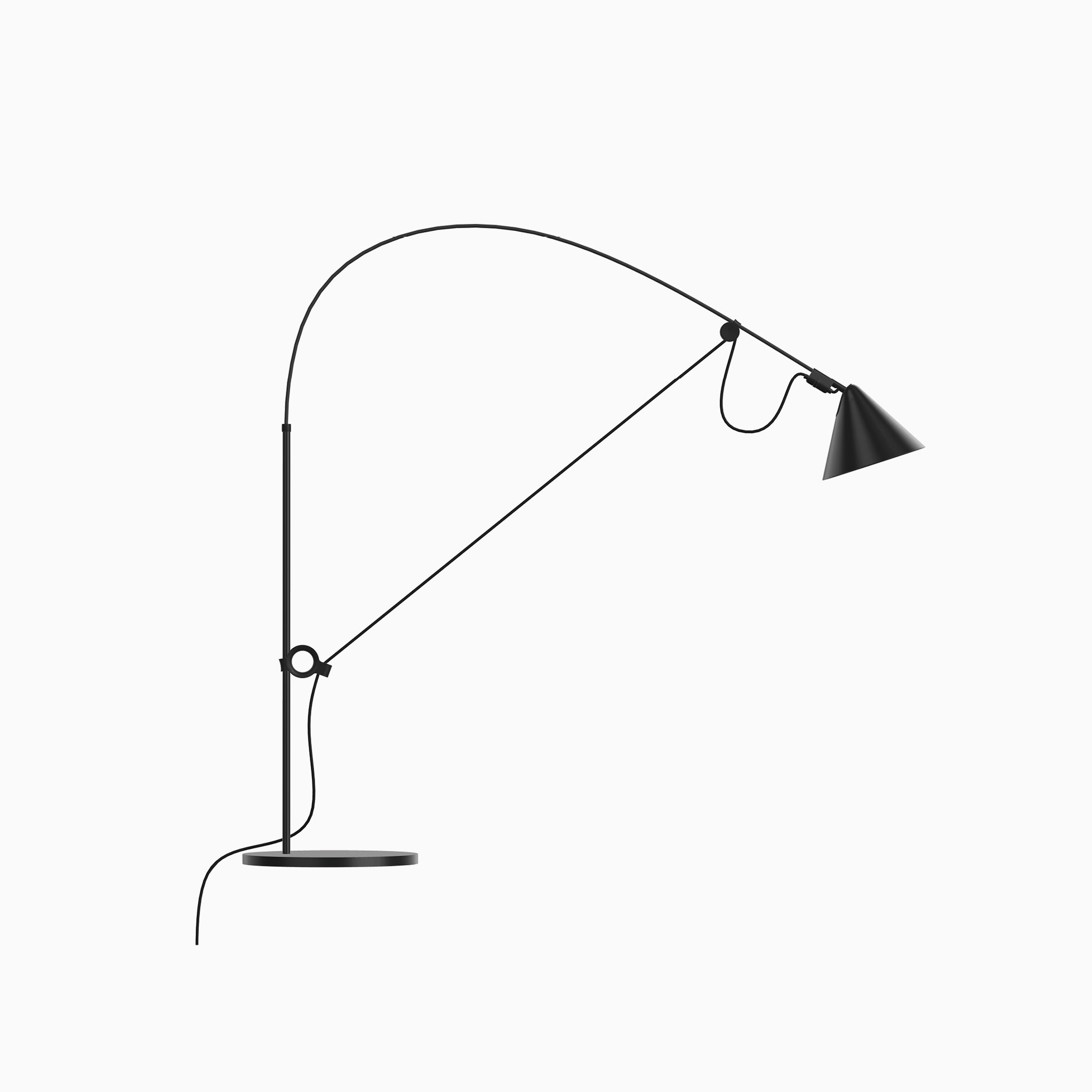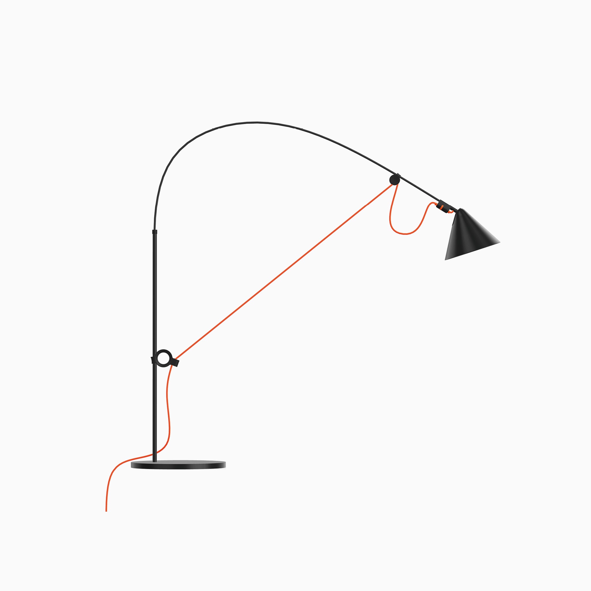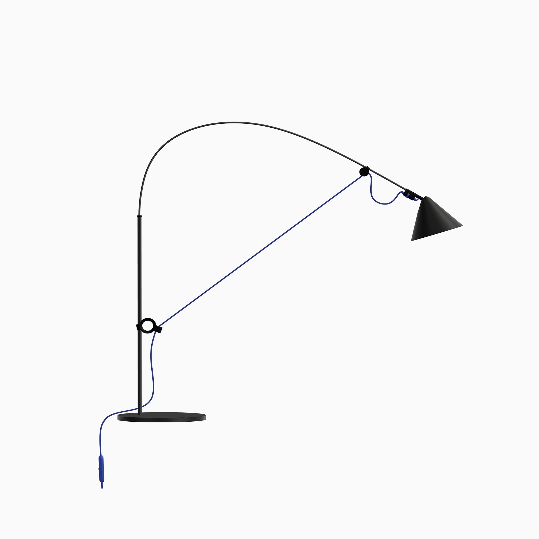 Central feature of the AYNO lighting family is a fiberglass rod, which is stretched to the bow by the luminaire cable. The inherent tension of the rod allows a lamp without any joints. By sliding the two adjustment rings attop and bottom, the fiberglass rod is bent into the desired position and the light is directed where needed. The cable tightens the rod into an arc, of which the radius can be varied as required using the adjustment rings. The fine adjustment is done with the swiveling lampshade.