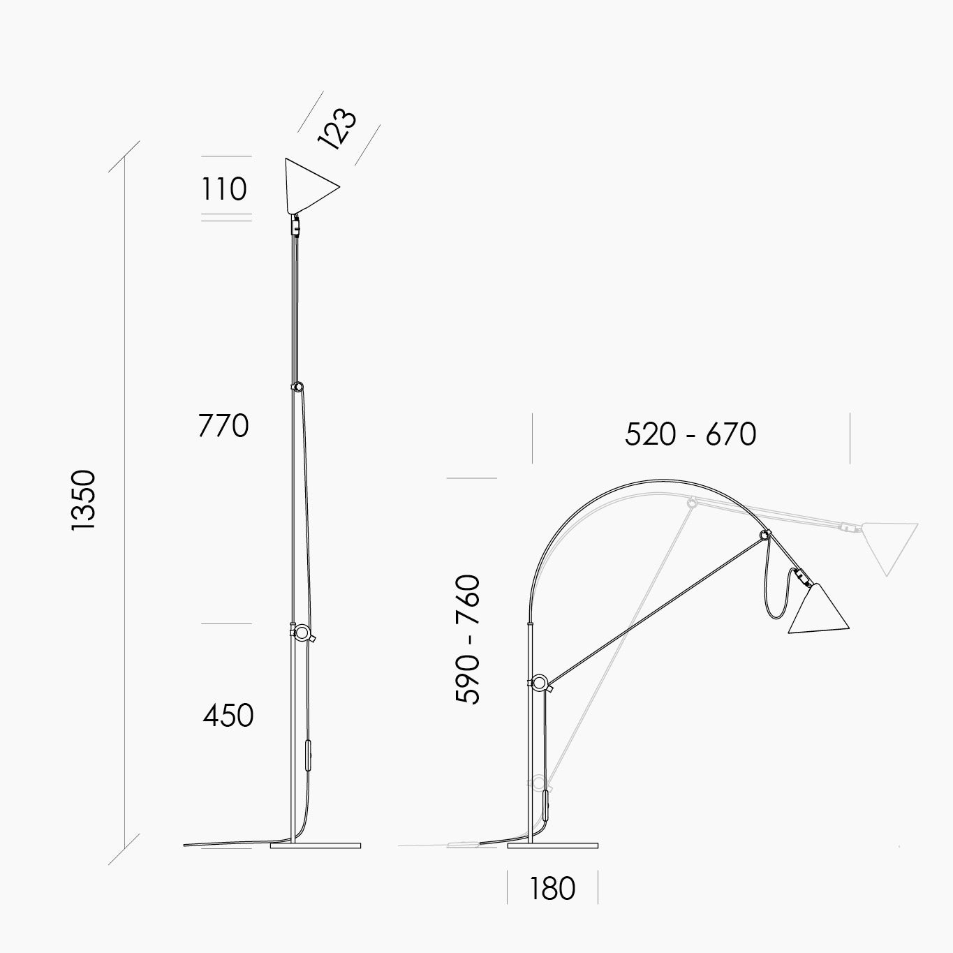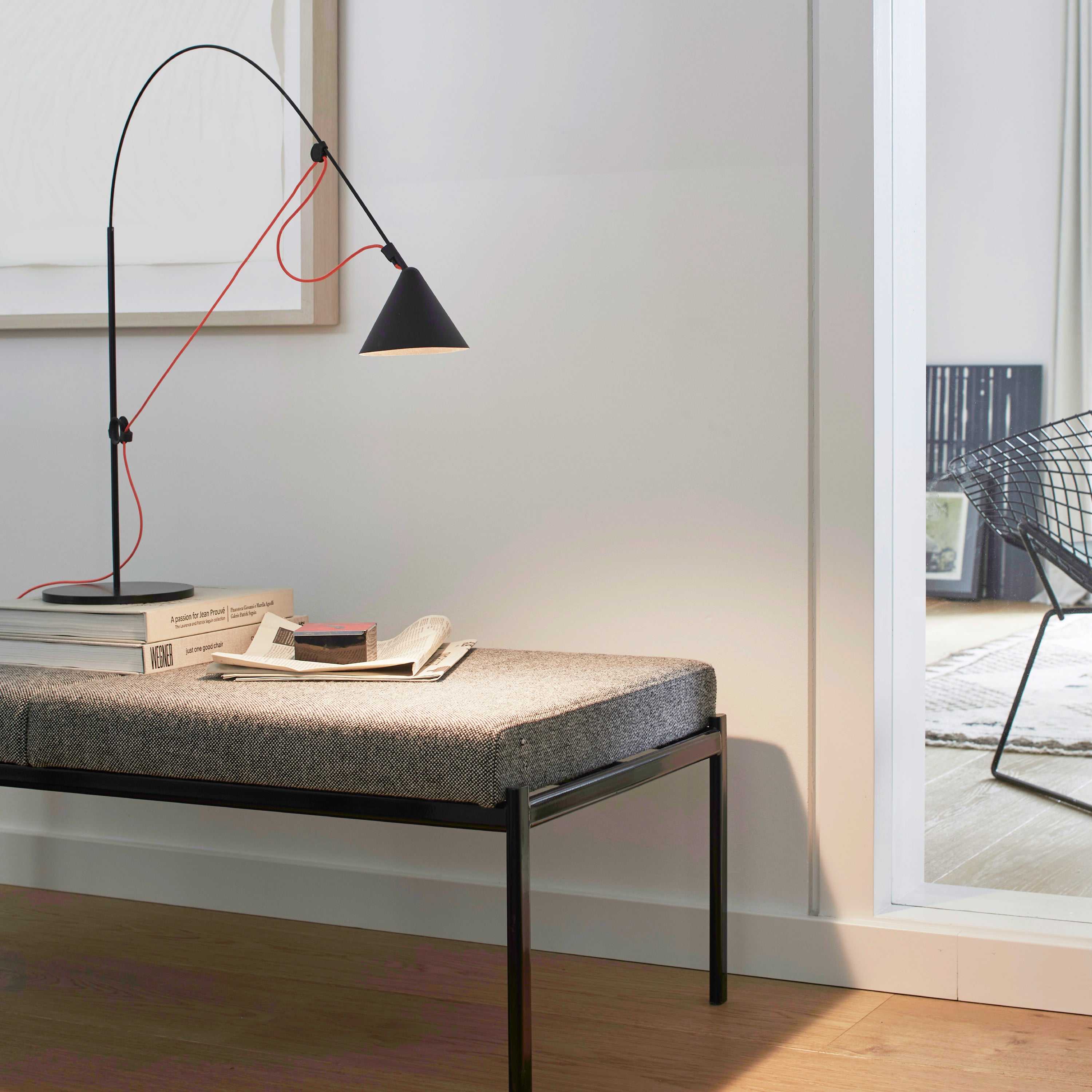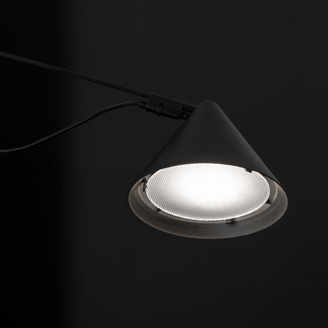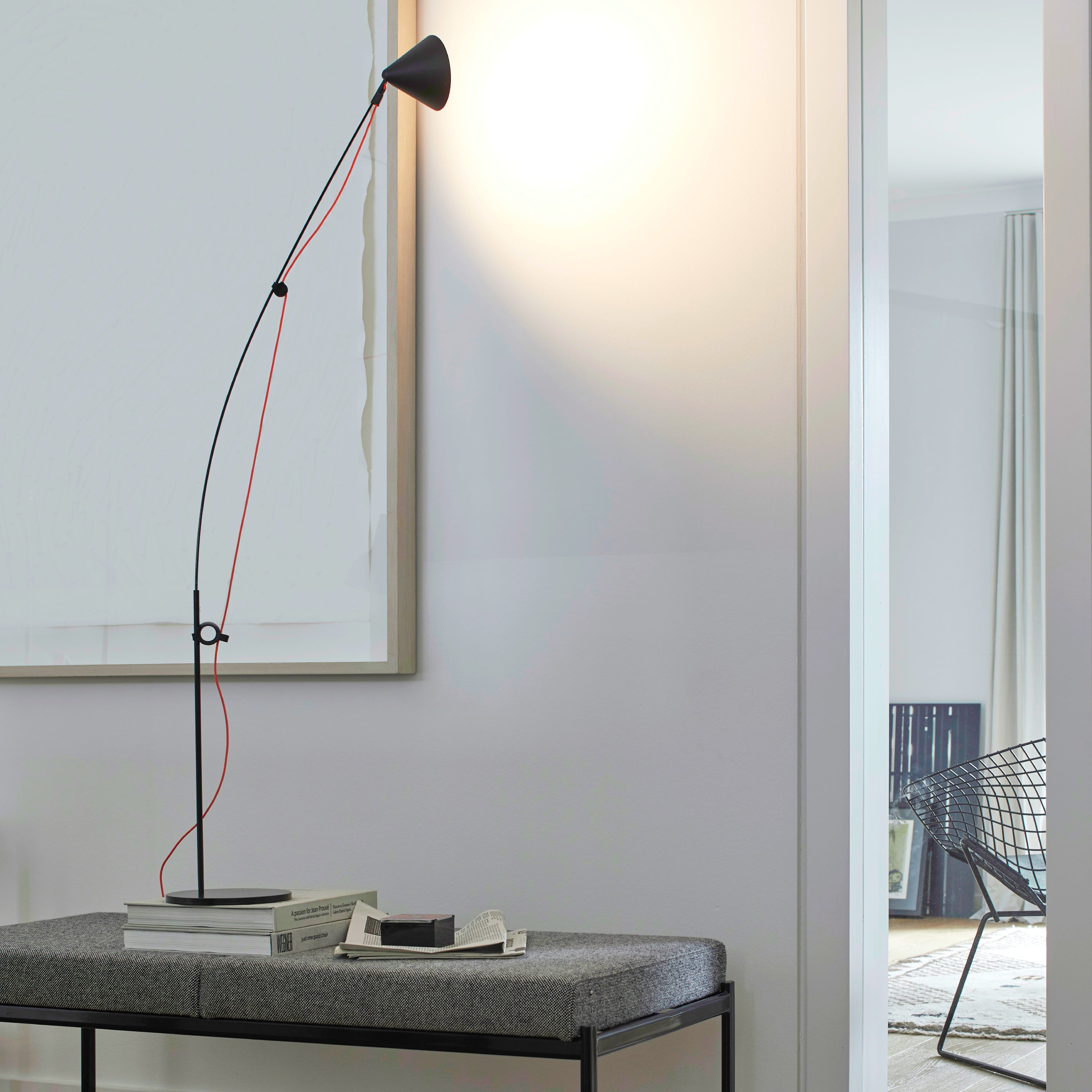 Central feature of the AYNO lighting family is a fiberglass rod, which is stretched to the bow by the luminaire cable. The inherent tension of the rod allows a lamp without any joints. By sliding the two adjustment rings attop and bottom, the fiberglass rod is bent into the desired position and the light is directed where needed. The cable tightens the rod into an arc, of which the radius can be varied as required using the adjustment rings. The fine adjustment is done with the swiveling lampshade.