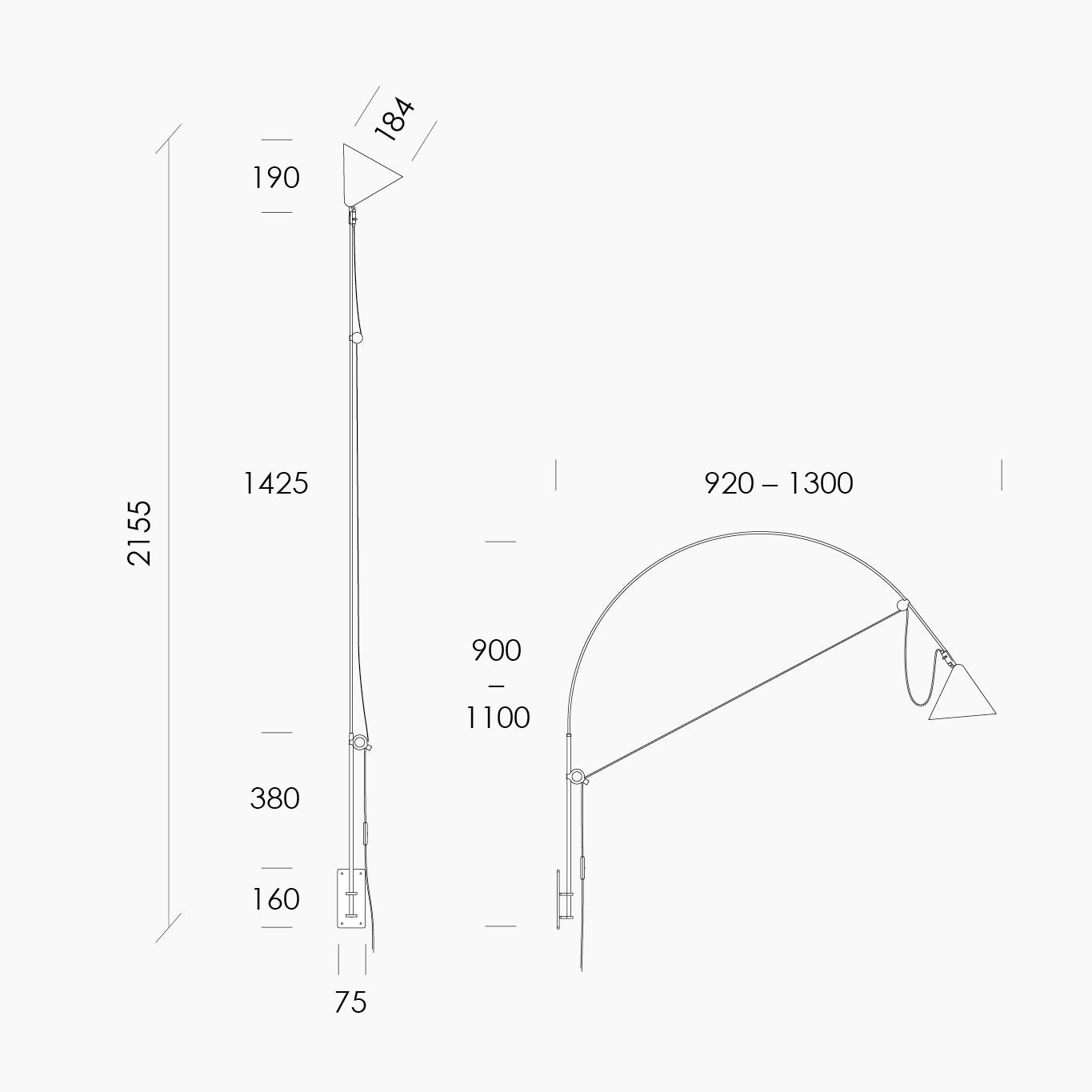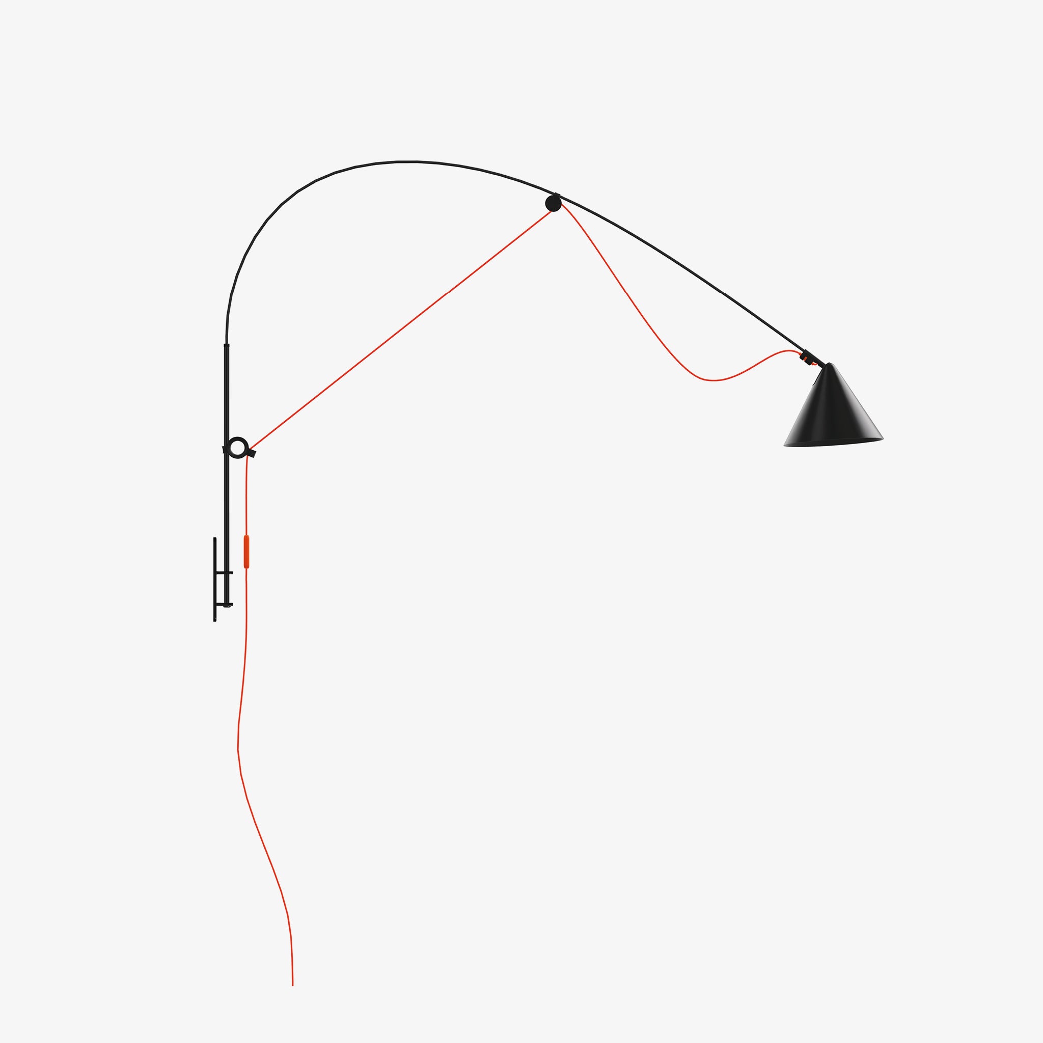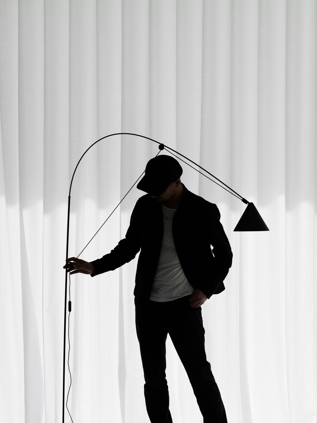 Central feature of the AYNO lighting family is a fiberglass rod, which is stretched to the bow by the luminaire cable. The inherent tension of the rod allows a lamp without any joints. By sliding the two adjustment rings attop and bottom, the fiberglass rod is bent into the desired position and the light is directed where needed. The cable tightens the rod into an arc, of which the radius can be varied as required using the adjustment rings. The fine adjustment is done with the swiveling lampshade.